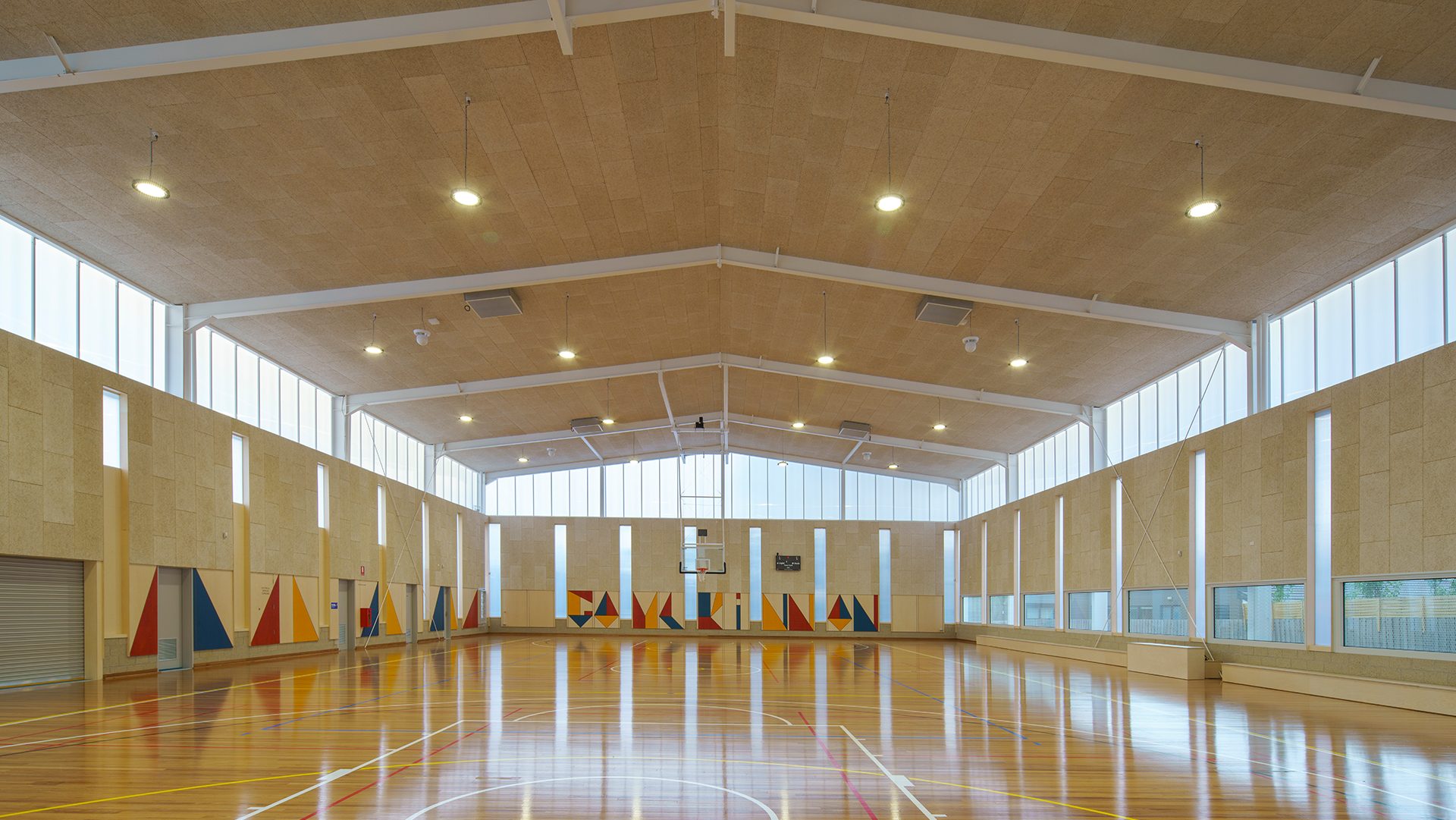 A fine example of art and plywood panels combining beautifully can be seen in the McKinnon Secondary College Gymnasium, where Maxi Panel extends across the lower sections of the walls adding the natural warmth of timber combined with vibrant pops of red, blue and gold. At first glance, it seems a simple abstract design but when you look closely, the pre-finished triangular plywood panels actually spell out ‘Go McKinnon!’ Representing the school’s colours, White Terrace, Red Dust, Blue Pacific and Sun Flower were chosen from the huge range of pre-finished Maxi Colour shades, adding a sense of fun and connection to this impressive space.