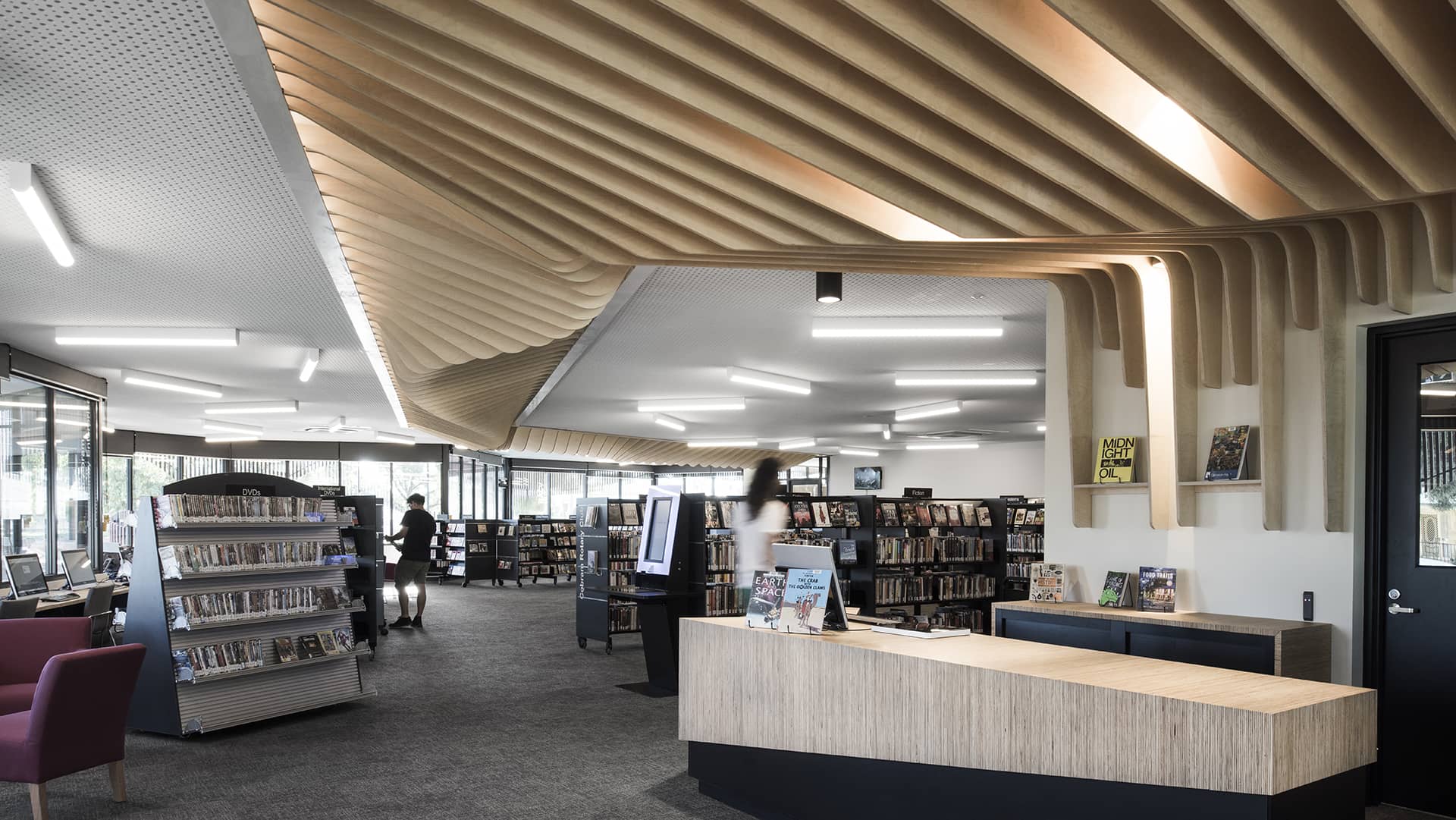 Another contemporary trend in plywood panels that we are noticing more is feature elements with a staggered effect, such as the spectacular fin design that extends across the ceiling in the Cobram Library. The fins of the design have been carefully positioned to create a wayfinding effect, guiding visitors effortlessly through in a gentle way that is perfectly suited to the tranquil library environment.
