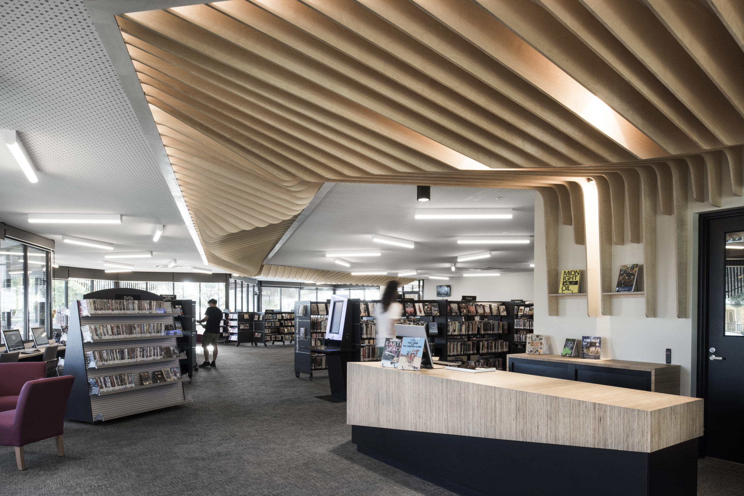 Demonstrating that just about anything is possible with timber ceiling panels, the Cobram Library utilised Maxi Panel ceiling panels to create an impressive fin design, carefully positioned to run through the centre of the space. Acting as a visually stunning wayfinding spine, the plywood ceiling subtly guides visitors through the space and all the way back to the librarian’s desk.