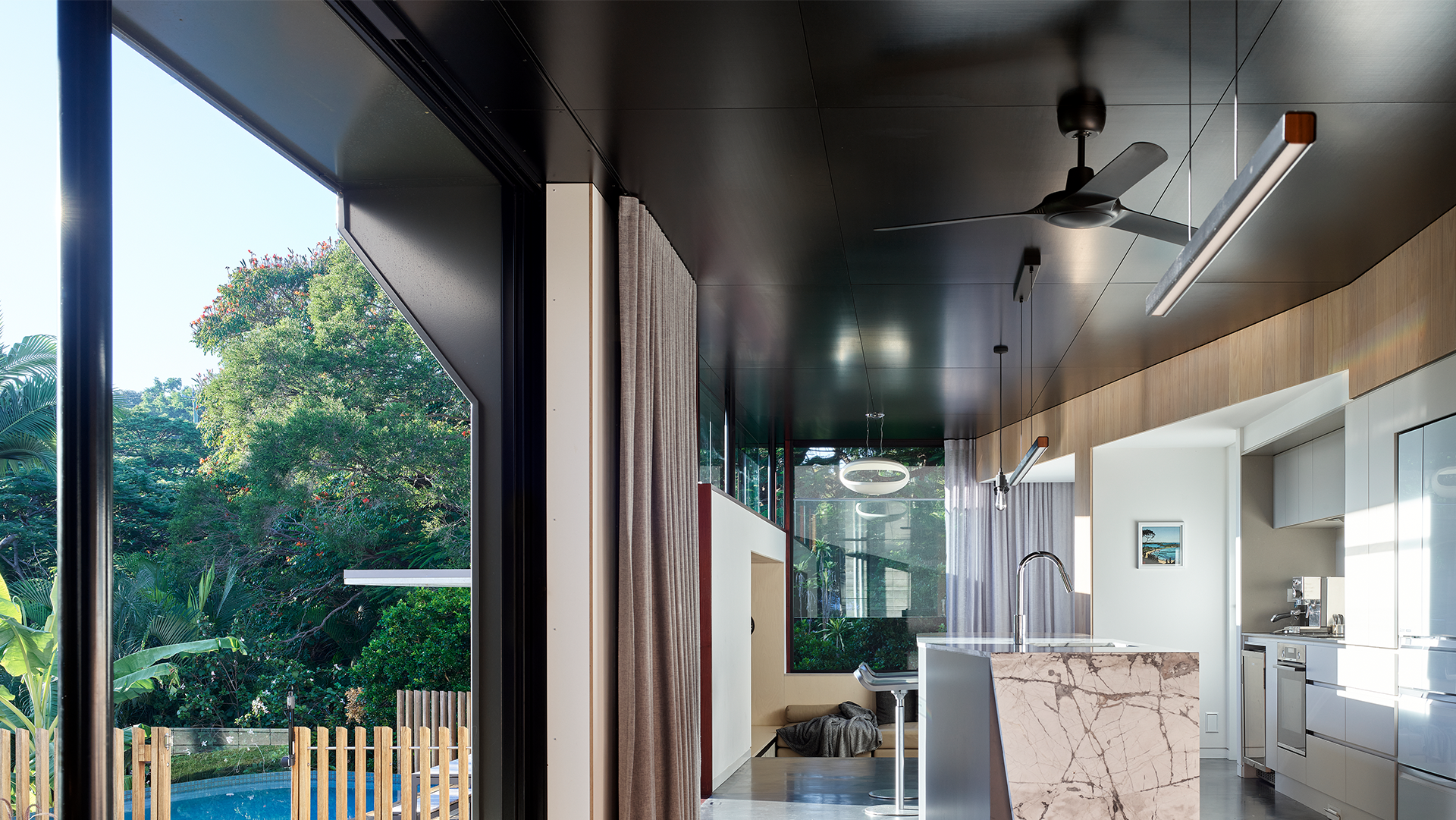When the owner (who is also the architect) of the striking Red Hill House needed a black ceiling panel that would absorb the harsh light of the Queensland sun and ‘diffuse it back throughout the interior to produce a gentle ambience’, Maxiply Maxi Film in Black proved the perfect choice. Beautifully complemented by the modern interiors and lush greenery of the landscape, the black ceiling brings a sense of calm to the space, while also adding a dash of drama.